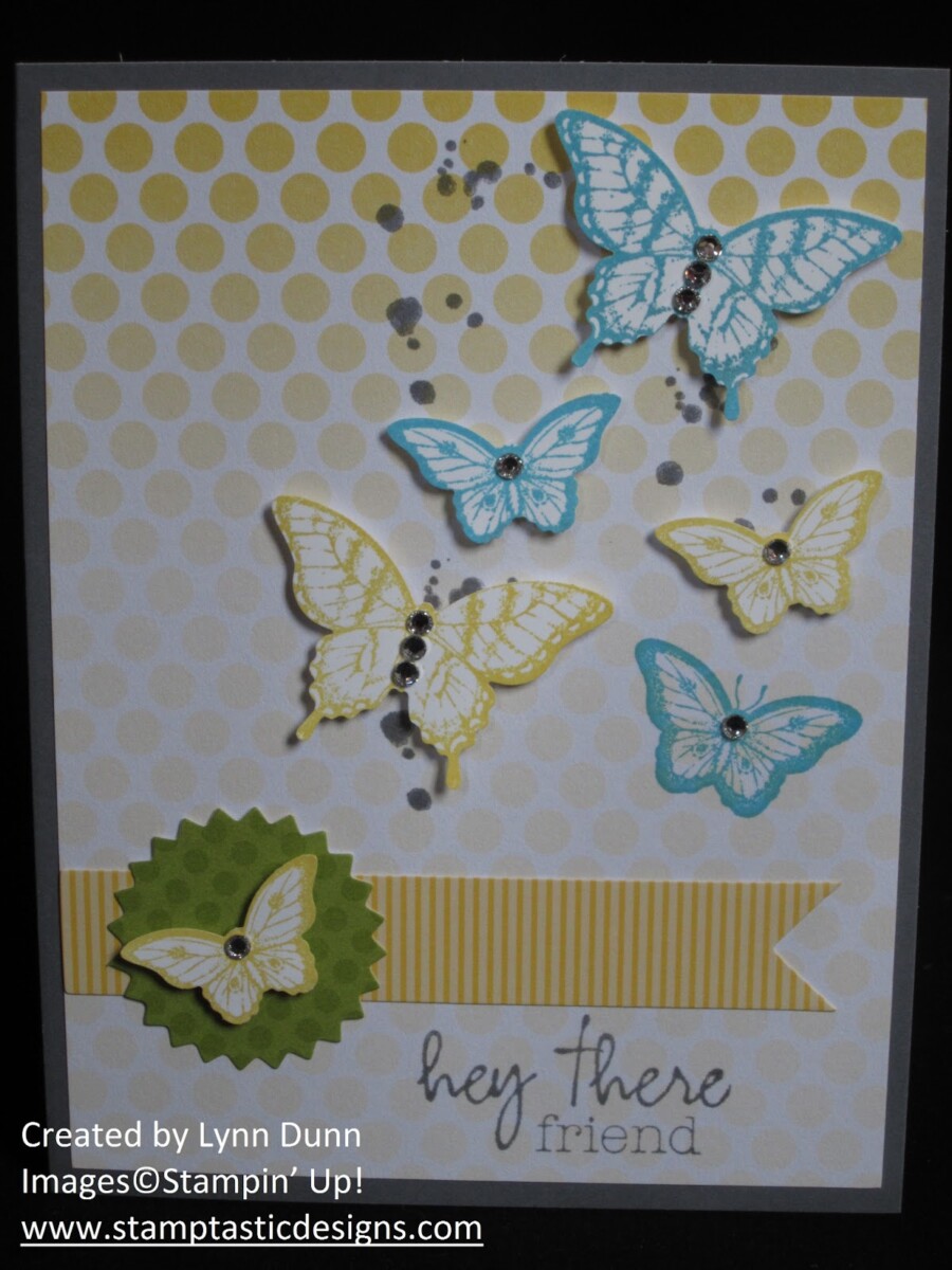 I designed this card with all of the materials that came with the monthly paper pumpkin kit…but then I added the butterflies and rhinestones to give the card a bit of a twist! This is the cool thing about paper pumpkin…you can put the project together by following the instructions that are included or…you can use your imagination and a few other stampin’ products you have to design it your way! For more information about this awesome program, click on the Paper Pumpkin Monthly Kit tab at the top of this website!