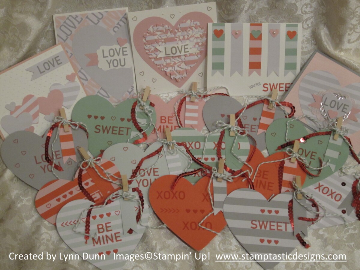 Good Morning! My grandson has kept me sooooo busy for the past few days that I haven’t been able to post any fun projects for all of you! Those little 3 year olds sure can keep ya hopping! 🙂 Today I want to share some of the fun projects I created with materials from the January 2016 Paper Pumpkin kit called Cute Conversations. As you can see, this particular kit had a Valentine’s Day theme. The kit contained enough materials to make a variety of little heart treat pouches and a banner. I decided to create a few cards and treat pouches with the materials, instead of a banner, so that I can give out some fun little gifts to the ladies at my Valentine’s Day class this week.