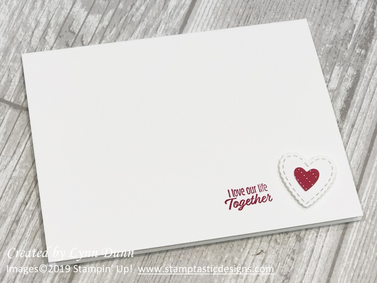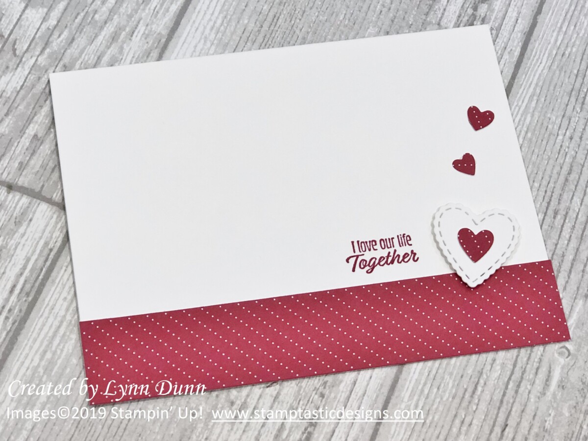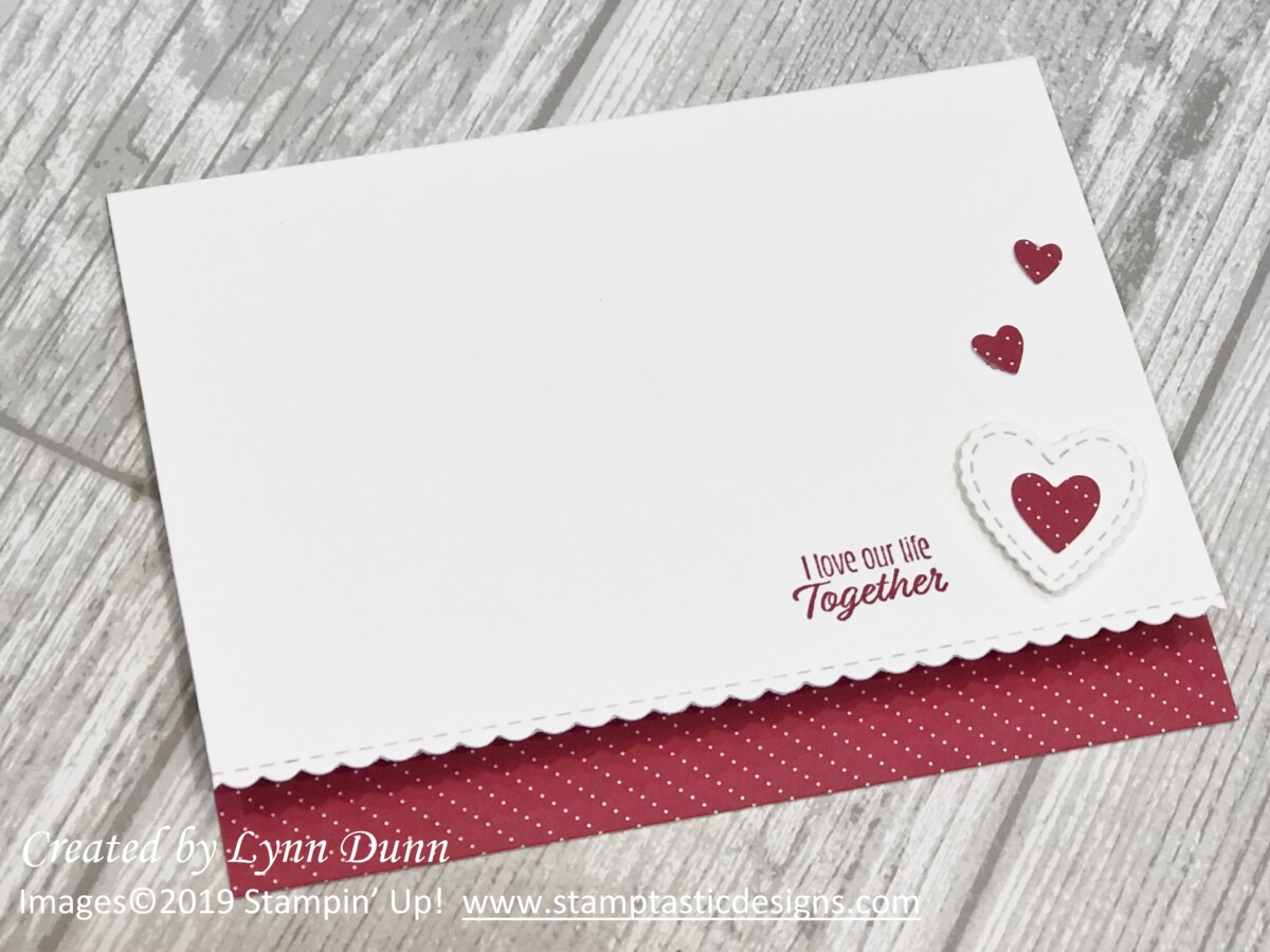 The heart shapes on these cards actually form the right side of the card front. To create this fun look, simply cut off approximately 3/4 – 1 inch of the right side of the card front. Cutting a bit off the card front enables you to use the heart shapes to create a fun little edge for the card. Watch the video below to get a better idea on how it works.