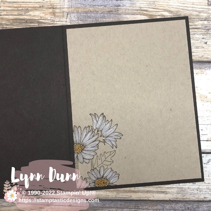 You can also stamp the daisies on a 5-1/4 x 4 inch piece of crumb cake cardstock to decorate the inside of the card. Color in the images using the white and daffodil delight watercolor pencils.